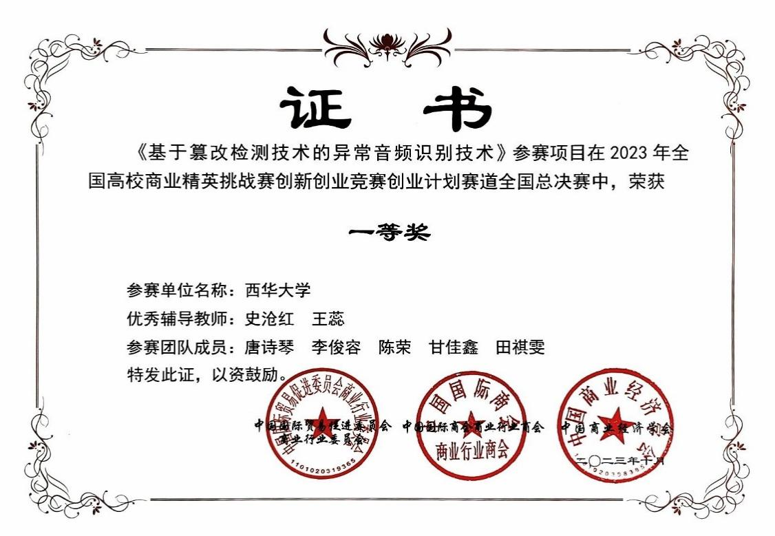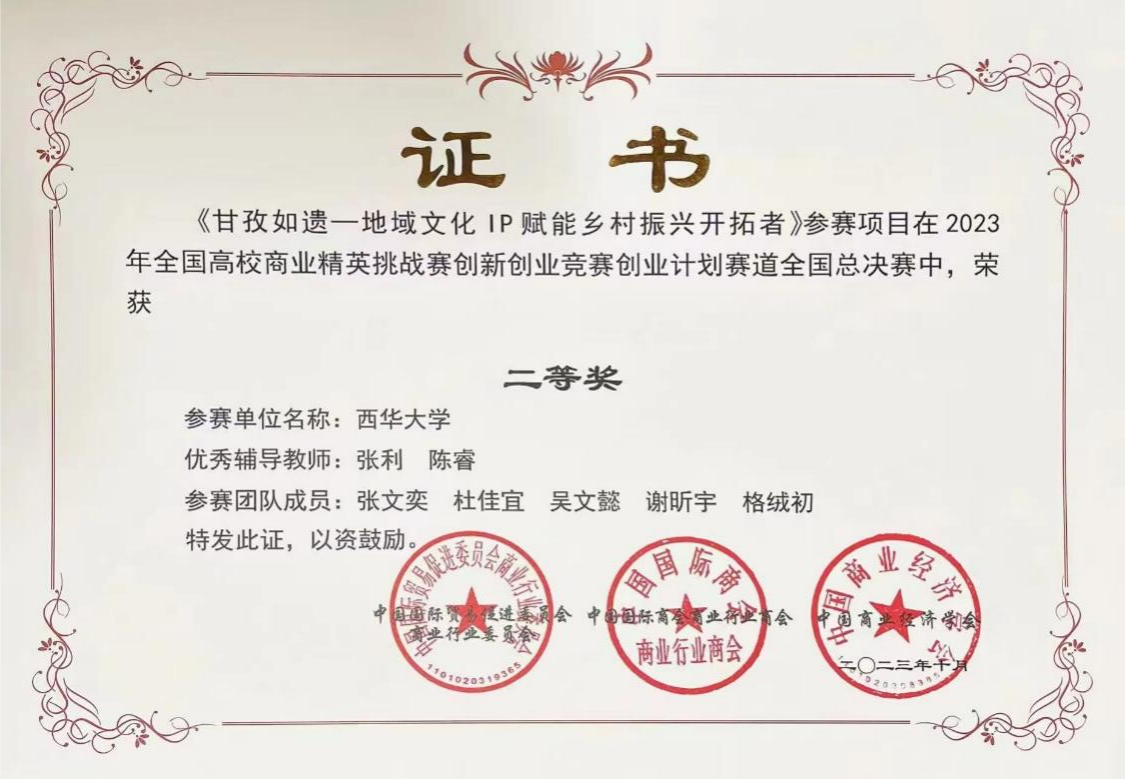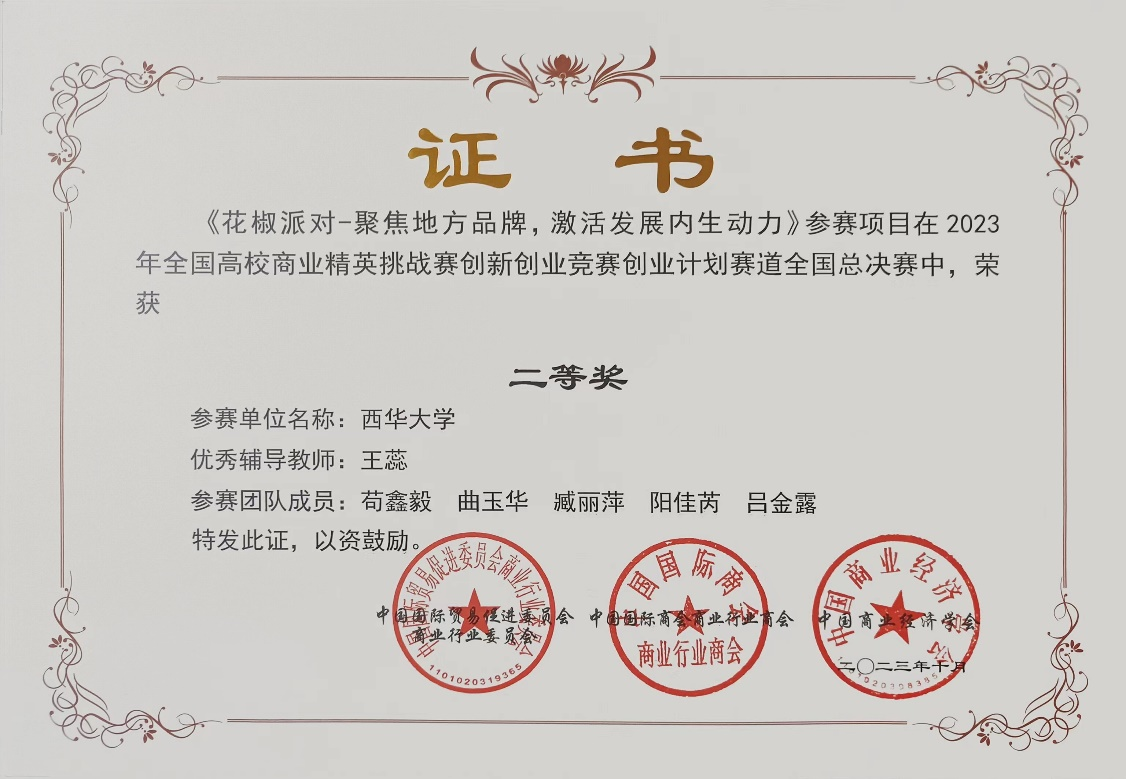近日,由中国国际贸易促进委员会商业行业委员会、中国国际商会商业行业商会、中国商业经济学会主办的2023年全国高校商业精英挑战赛创新创业竞赛创业计划赛道全国总决赛圆满结束。由我院唐诗琴同学带领,王蕊老师和史沧红老师(计算机与软件工程学院)指导的捕风捉影团队获得创客组全国一等奖;由我院苟鑫毅同学带领,王蕊老师指导的创意精灵团队获得创客组全国二等奖;由我院杜佳宜和谢昕宇同学参与,张利老师和陈睿老师(文学与新闻传播学院)指导的甘孜如遗团队获得创客组全国二等奖。我院王蕊老师和张利老师也获得了“优秀辅导教师”称号。
