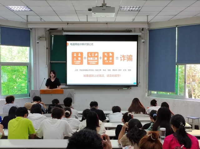 紧接着,由尚文杰主持防诈骗安全教育环节。尚文杰主要从电信网络诈骗的介绍、电信网络诈骗的识别、上当受骗后的处理措施等方面进行讲解。她针对目前常见的诈骗手段进行了详细解析,如网络购物诈骗、虚假投资诈骗、冒充熟人诈骗等。在此提醒了同学们要增强防范意识,对于陌生事物,要时刻保持警惕,不轻信陌生人的话语,遇到可疑情况及时向家长、老师咨询。最后张玲就电信诈骗进行补充和讲解了一些警示案例,让同学们更深切的意识到,诈骗就在身边,时刻提高防诈骗意识。