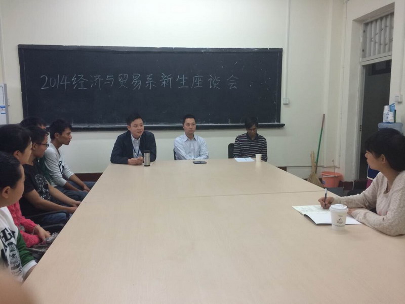 10月9日上午9点,经济与贸易学院在学院经济贸易系、商务管理系和金融投资系三个系部办公室同学院2014级各专业新生代表召开座谈会。学院党委书记兼副院长李雪玫、院长卓武扬、党委副书记兼副院长郑宇、副院长兰红以及各系部主任和学院教师代表一同参加了本次座谈会。