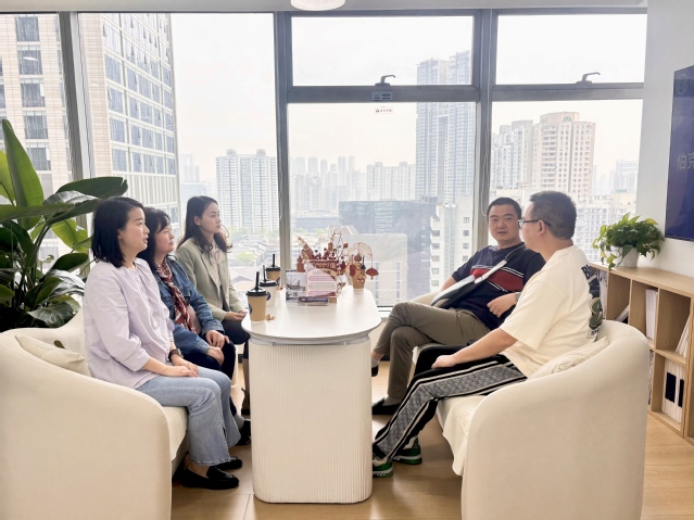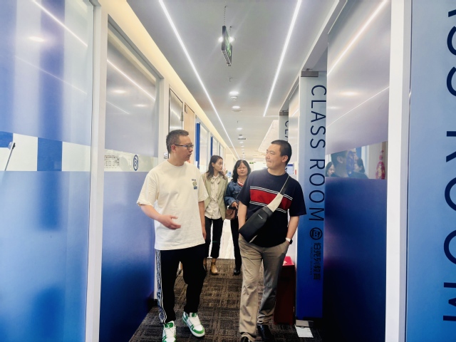 在颜钢校友的陪同下,学院领导老师首先参观了集团总部,详细了解企业发展历程、企业文化及工作环境。良好的企业工作环境,良好的业务发展势头,以及颜钢校友对行业的深刻理解,让人受益匪浅。易宇峰代表学院再次邀请颜钢校友近期回校开展关于行业的专场讲座,结合企业业务尽量为学习学妹们提供更多的实习、就业机会,在语言领域提供更好的深造、发展机会。颜钢校友欣然接受了学院邀请,表示一定全力以赴配合学院工作,为学弟学妹们提供力所能及的支持和帮助。双方就深化校企合作交流,搭建校友平台,共同助力学院和学生发展等内容进行了深入探讨,达成了多项重要共识。