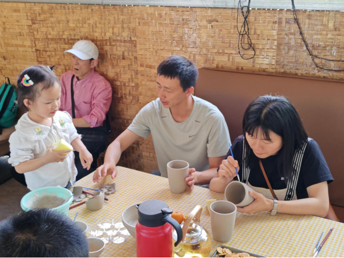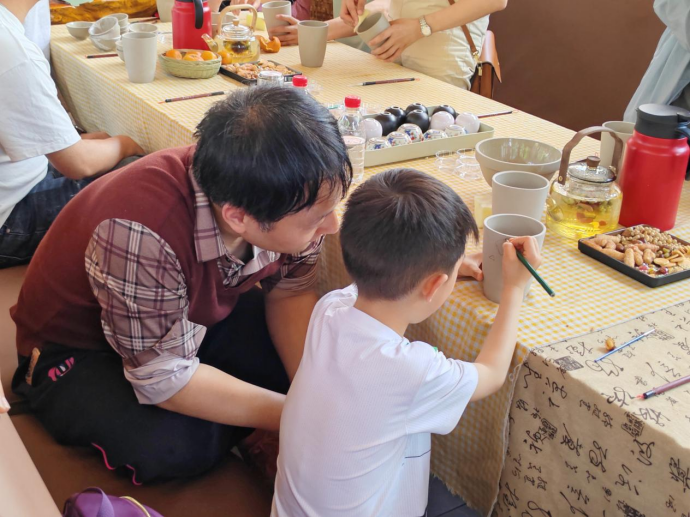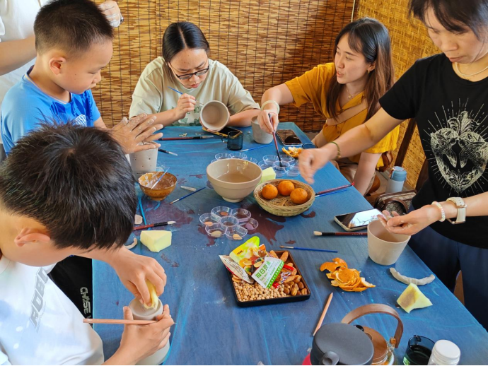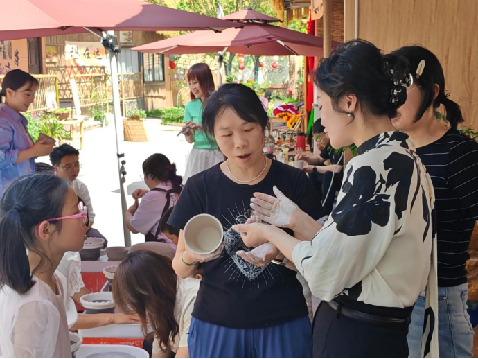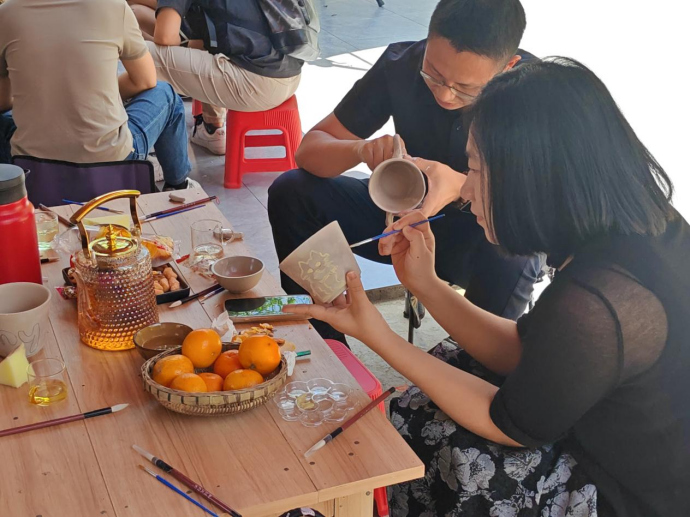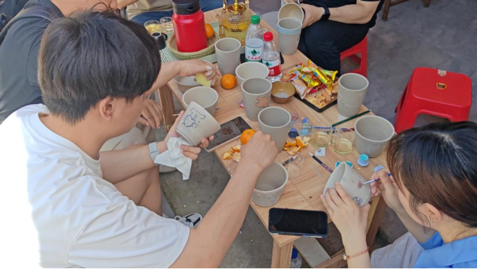 下午的创作环节将活动推向高潮。在天仁公园非遗体验馆内,教职工分组进行陶艺创作。拉坯机飞转间,泥团在指尖幻化成形,传承人现场示范茶杯、花瓶等器皿制作要诀。下午的陶艺体验馆内欢声笑语不断,釉彩区里,非遗传承人穿梭指导,大家用颜料笔蘸取青花料勾画纹样,或用海绵拍打出渐变肌理。百余件待烧制的素坯摆满长桌,从写意山水盘到萌趣马克杯,每一件都凝结着手作的温度。教师们捧着自己的“宝贝”,脸上洋溢着自豪和喜悦的笑容。大家纷纷表示,这次活动不仅让自己学到了陶艺知识和技能,更让自己深刻感受到了非遗文化的博大精深和独特魅力。同时,也在繁忙的工作之余,放松了身心,增进了同事之间的感情,收获满满。
