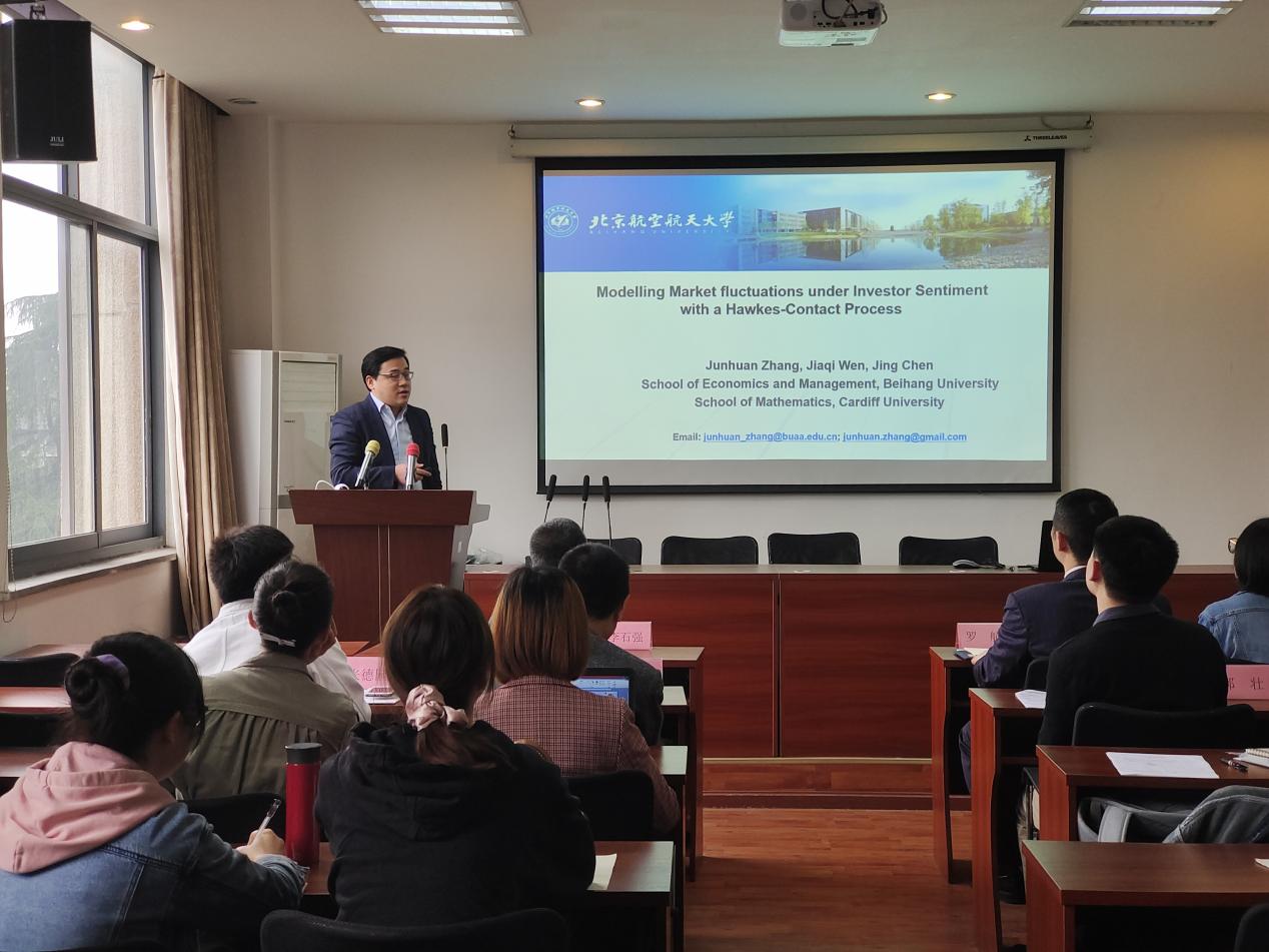 来自北京航空航天大学的张军欢副教授以“Modelling Market Fluctuations under Investor Sentiment with a Hawkes-Contact Process”为题进行报告。文章在传统Hawkes模型基础上,结合投资者情绪提出了一新Hawkes过程。结果表明,相比传统模型,新模型可以实现与实际收益率的紧密拟合。
