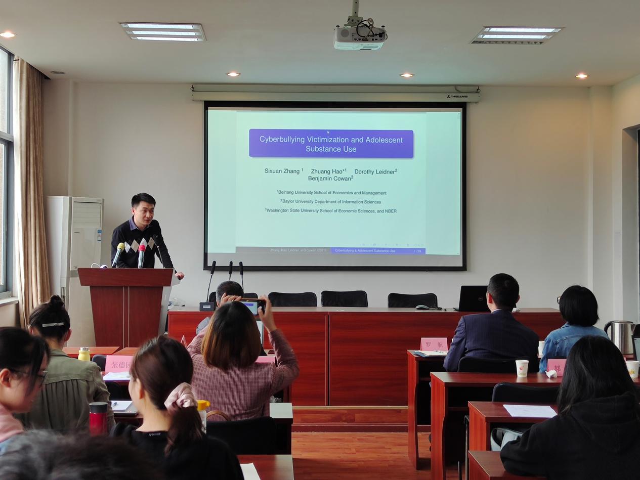 来自北京航空航天大学的郝壮老师以“Cyberbullying Victimization and Adolescent Substance Use”为题进行报告。文章通过倾向得分匹配法比较了网络欺凌和传统欺凌下受害者对物质使用情况。结果表明,科技进步导致的网络欺凌行为会加剧受害者危险物质使用的增加。