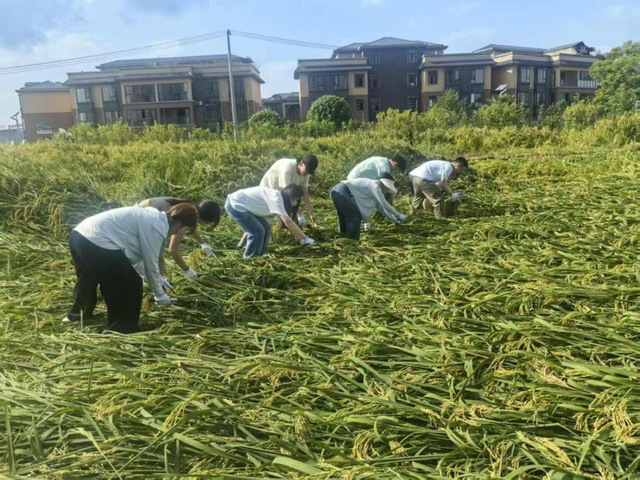 镰刀挥舞,稻穗归仓。在抢收劳动中,同学们分工协作,挥镰、递稻、捆扎,动作虽显生涩却充满热情。“抢收下来的稻穗,沉甸甸的,那是劳动的重量,更是共产党员践行初心使命的分量。”学生党员陈思伶擦着汗水说道。这场发生在田埂上的“大思政课”,让同学们在汗水中读懂了“中国饭碗”的分量,在丰收的喜悦中见证了自身的成长与蜕变。