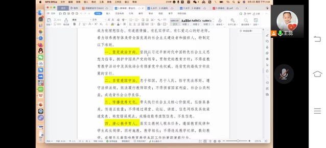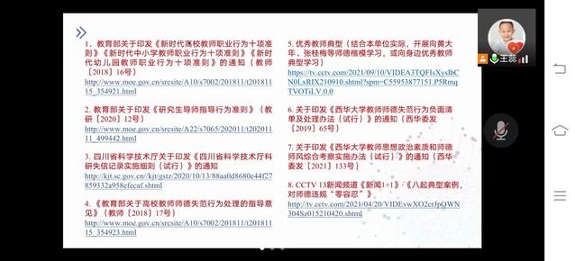 王蕊首先介绍了本次活动的背景,然后解读了相关师德专题文件,包括《新时代高校教师职业行为十项准则》、《研究生导师指导行为准则》、《教育部关于高校教师师德失范行为处理的指导意见》、《西华大学教师师德失范行为负面影响清单》和《西华大学教师思想政治素质和师德师风综合考察实施办法》。王蕊指出,各位教师需仔细研读相关文件并落实文件精神,做到坚定政治方向、自觉爱国守法、传播优秀文化、潜心教书育人、坚持言行雅正、遵守学术规范、秉持公平诚信、坚守廉洁自律、积极奉献社会,并将师德评价作为职称评定的重要标准。最后,老师们还集体学习了黄大年老师、张桂梅老师的优秀事迹。本次活动号召老师们向这些优秀教师典型学习,将育德树人作为终身职业准则。