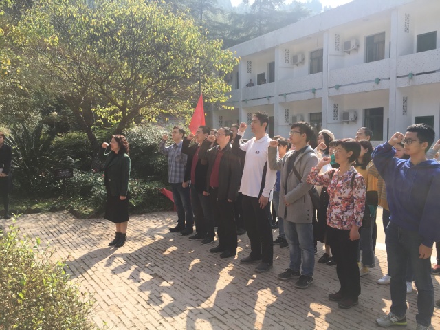 在邓稼先旧居的纪念铜像前,大家排好队,依次上前献上鲜花,深深的鞠躬,表达我们崇高的敬意与深深的感谢,全程没有人说话,大家都在静默,都在悼念那已远去的人。全体党员同志在学院党委书记李雪玫书记的带领下,重温入党誓词,大家庄严宣誓。
