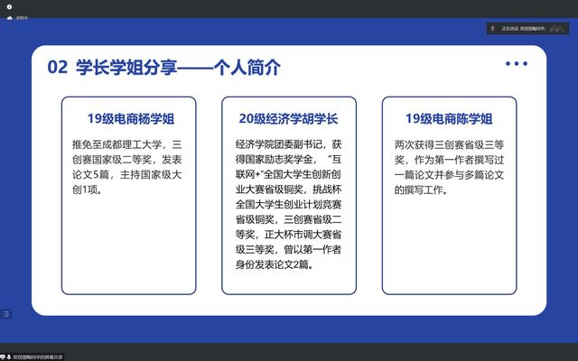 之后,2019级学姐杨雅麟、陈蕊,2020级学长胡剑波针对会议前搜集整理的九大赛事问题进行了一一解答。参会学生纷纷表示收获颇深。