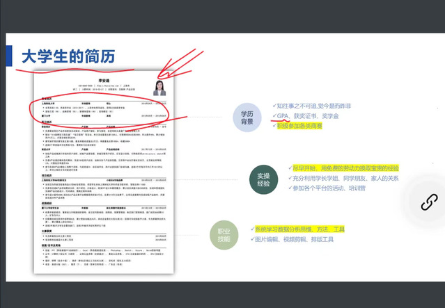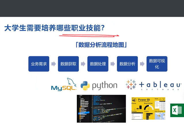 在简单的互动后,Sophie以“大学生的简历”引出大学生需要培养哪些职业技能。其中,指出重点需要大学生掌握以业务需要、数据获取、数据处理、数据分析和数据可视化为主要步骤的的数据分析技能。