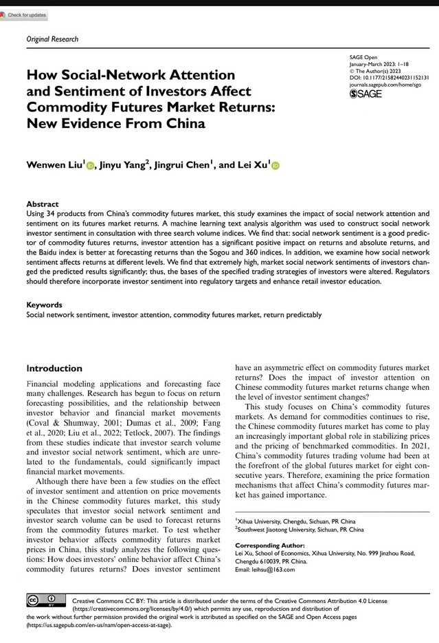 betway必威西汉姆联刘文文教授和2018级研究生杨瑾谕合作撰写的论文“How Social-Network Attention and Sentiment of Investors Affect Commodity Futures Market Returns: New Evidence From China”在SSCI期刊 《Sage Open》(JCR二区)上发表(2023年1月,第1-3期,1-18页),由Elsevier(爱思维尔)出版社出版。