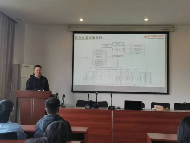 随后,就东方财富机构设置方面,吉加俊从证券公司结构、东方财富人数分布图和组织架构三方面进行说明,并以东方财富证券为例,向同学们展示了“互联网+”模式下的券商平台组成结构。