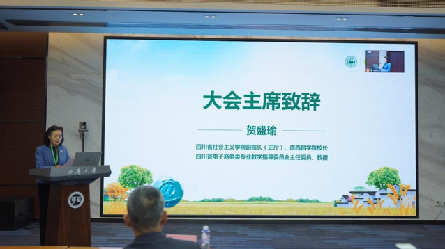 论坛大会主席四川省社会主义学院副院长(正厅)、原西昌学院校长、四川省电子商务类专业教学指导委员会主任委员、教授贺盛瑜教授致辞。她指出本次论坛的召开是顺应国家重大战略背景,在党的“二十大”和 2023 年全国“两会”胜利召开之际,为回顾总结电子商务在中国二十多年的发展,梳理电子商务在数字经济、乡村振兴、一带一路、数字化转型等重大项目中发挥的独特作用与特殊贡献。贺盛瑜强调电子商务为乡村振兴提供强大力量,发挥着更大的作用,体现更大作为。