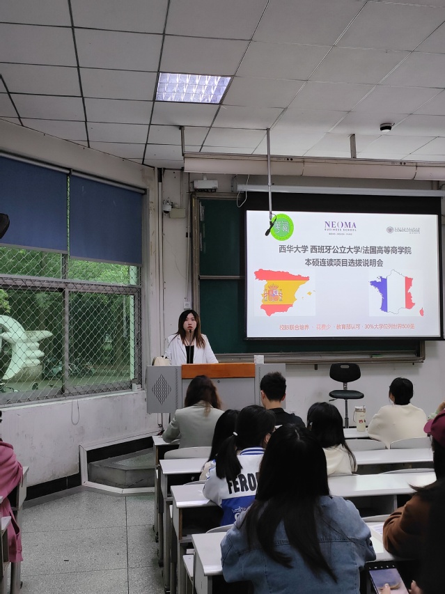 接着,李老师对西班牙的本硕连读项目进行讲解。李老师提出西班牙留学的优势——省时、省钱、中国教育部认可、优质、保障等。紧接着,李老师为同学们介绍了西班牙的三所大学,并列出其在世界大学的排名。最后,李老师表明西班牙留学不同于法国留学之处在于西班牙的留学要求与专业相对应,而法国则是允许跨专业。
