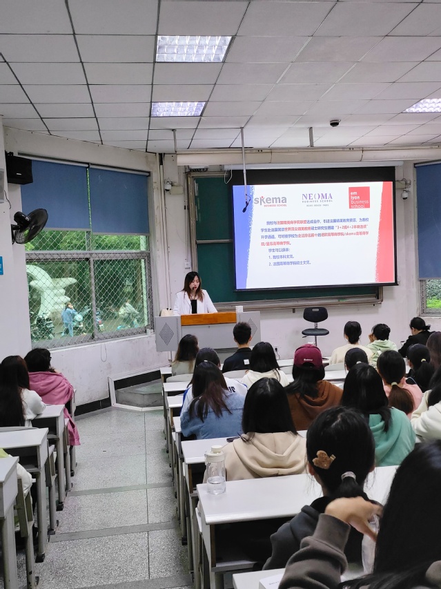 会议第一项,李潇潇老师给同学们讲解出国留学项目的相关事项。她指出如今考研形式竞争激烈,出国留学是另一个读研深造的好通道,并以此引出法国高等商学院的交流项目。经过简单地介绍法国风土人情之后,她指出法国不止有浪漫,还有精英教育。随后,李老师对法国的三所大学从学院排名、学院师资以及毕业生的薪资水平进行了深入的讲解,并列出学生在法国享有的福利。