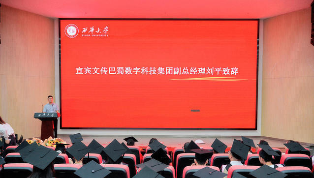 随后,宜宾文传巴蜀数字科技集团副总经理刘平上台致辞。他代表企业真挚欢迎毕业生们作为新鲜血液的到来,同时祝愿毕业生们前程似锦,并希望他们在未来走向人生的星辰大海的路途中,带着专业和拼搏,打造属于自己的一片天地事业。刘平特别点赞了曾在公司实习的两位宜宾校区毕业生,希望他们再接再厉、再创辉煌。