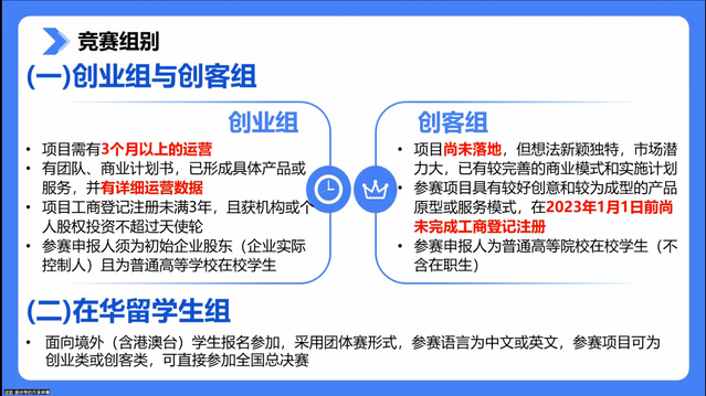 随后,唐诗琴着重进行了赛制讲解以及比赛收获的宣传。解读了不同组别存在的差异,勾勒了整个赛事的日程。同时,她强调了报名流程、指导老师以及组队等方面的注意事项,提醒各参赛团队按照组委会规定参赛。在比赛收获方面,她列举了此次参赛的可能收获有奖杯、荣誉证书及附加分等,再次鼓励有想法且符合参赛要求的团队将项目用于参赛。